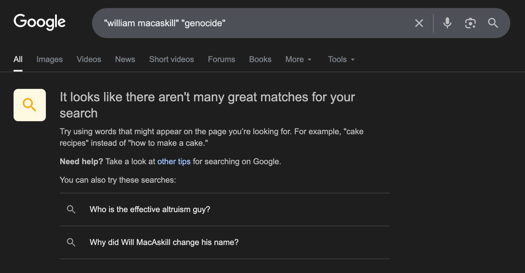 The UN General Assembly describes genocide as a crime so horrendous that it “shocks the conscience of mankind.” Yet MacAskill, Ord, Bostrom, and the others have said — to my knowledge — literally nothing about it publicly. This, from the supposedly most moral people in the world. The very least — and I mean very least — one could do is acknowledge such atrocities and express solidarity with the real altruists on the front lines fighting such evils. It takes 5 seconds to post an expression of support and solidarity on X or Bluesky.