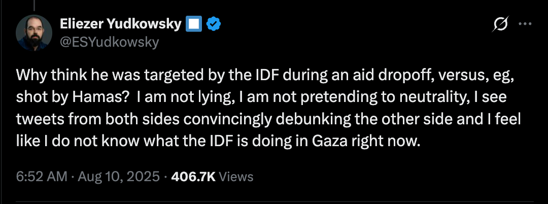 Incidentally, the self-described “genius,” Yudkowsky, has repeatedly questioned whether the Israeli Defense Force (IDF) is responsible for the atrocities and murders that happened in Gaza. He writes: