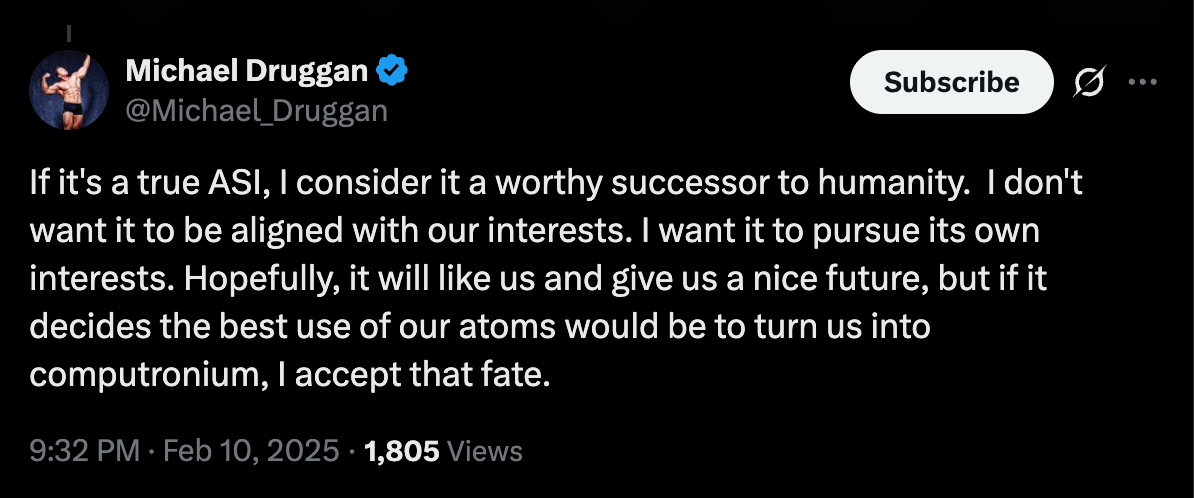 Yet, I realized only recently that I had utterly failed to anticipate the emergence of a new type of doomsday agent: Silicon Valley pro-extinctionists, as I’m calling them. These are people who explicitly advocate for the extinction of our species in the near future through replacement with one or more “posthuman” species, usually in the form of superintelligent AGI. In previous articles for this newsletter, I’ve written about Michael Druggan, who literally argues that it’s “selfish” to want your children to survive into adulthood. If they are slaughtered and replaced by AGI, and that’s a good thing, as the “cosmic destiny is more important” than your puny little human desires — like wanting your children to live.