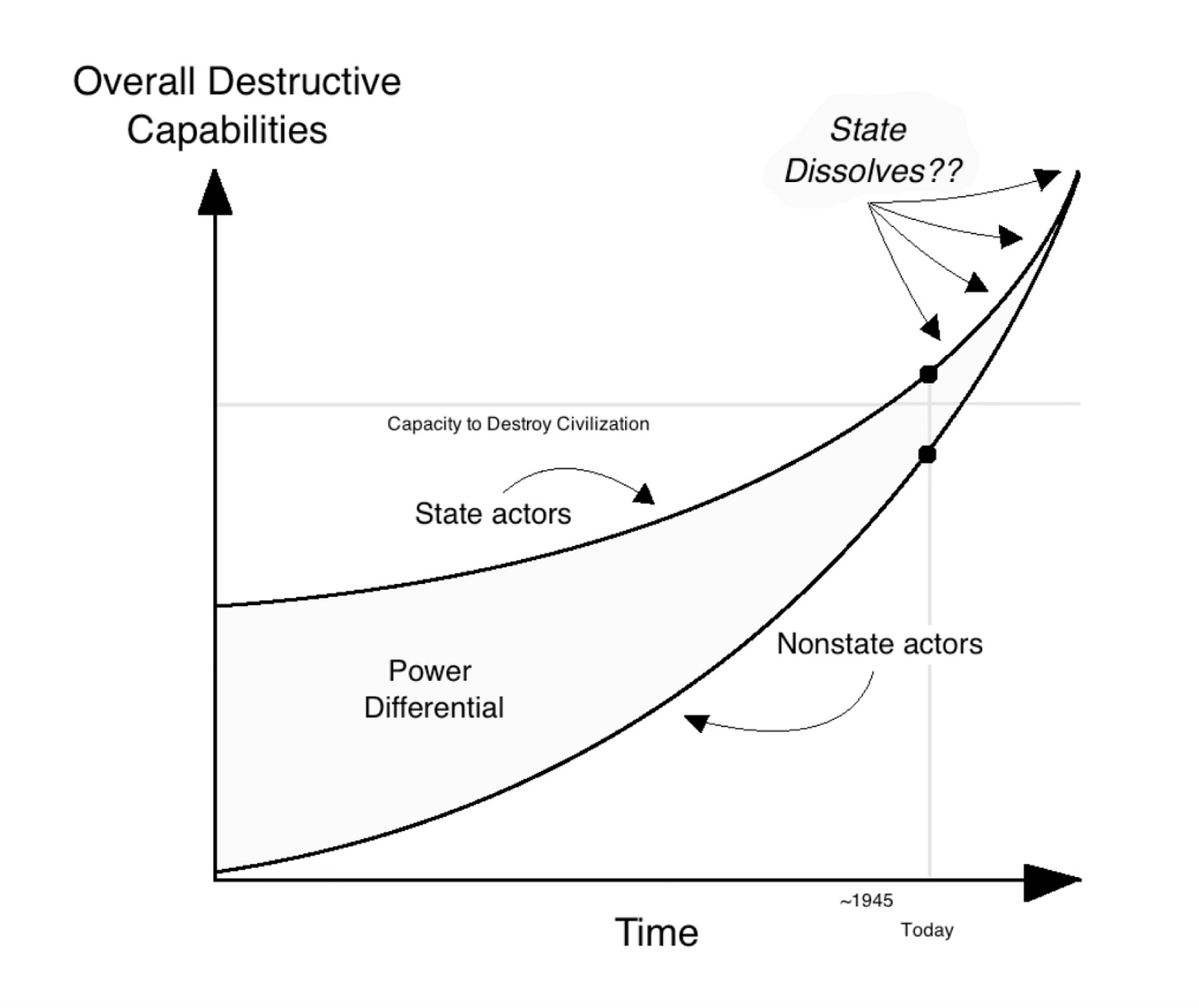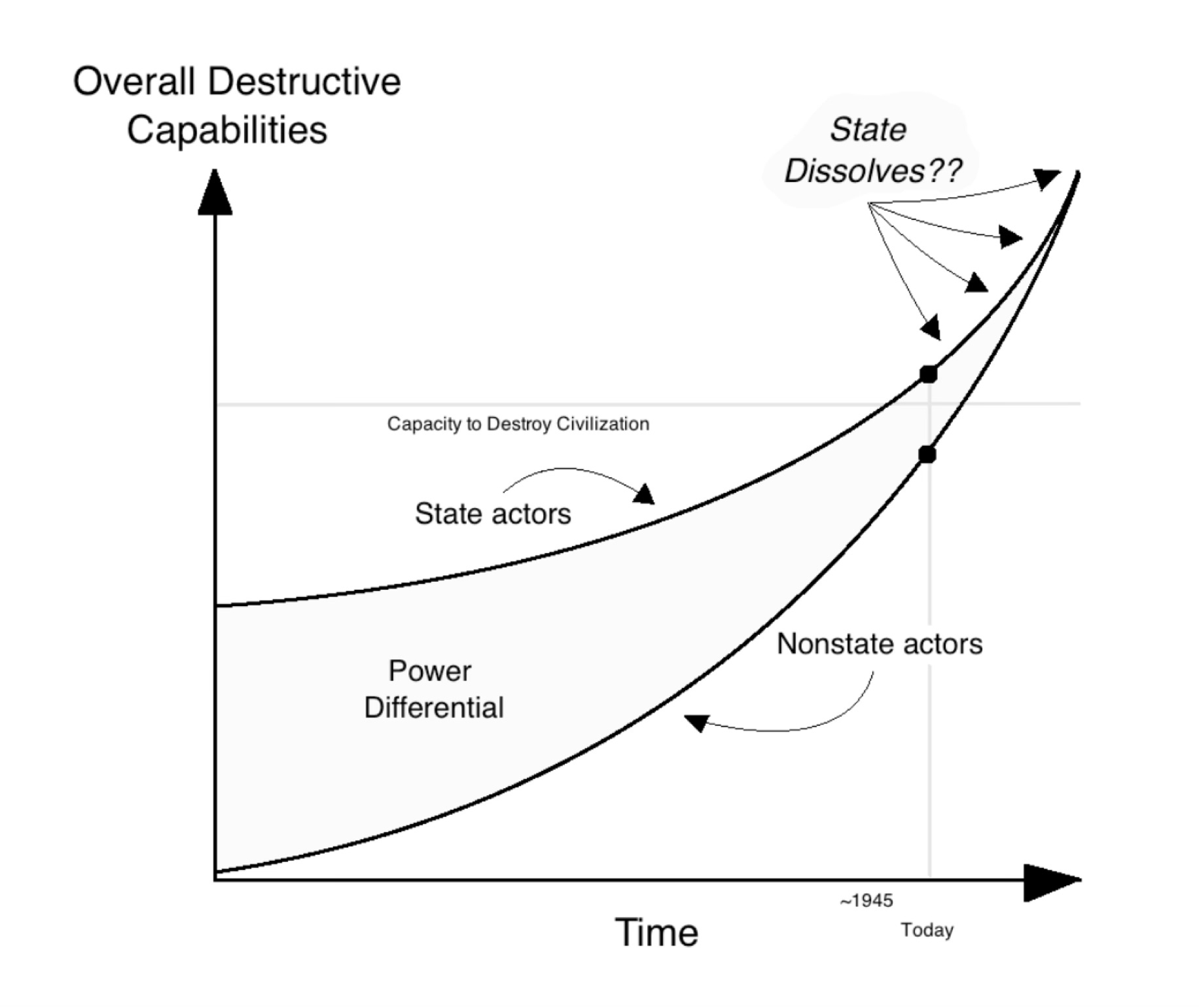 Enter omniviolence: what if individuals or small groups acquire extreme destructive capabilities? What if they have the same capacities for force and lethal violence as states? It seems like the social contract collapses, as the power differential diminishes. The modern state system cannot exist in such circumstances — or so it seems to me. (But what do you think?) Here’s a little diagram representing this from a paper I published several years ago: