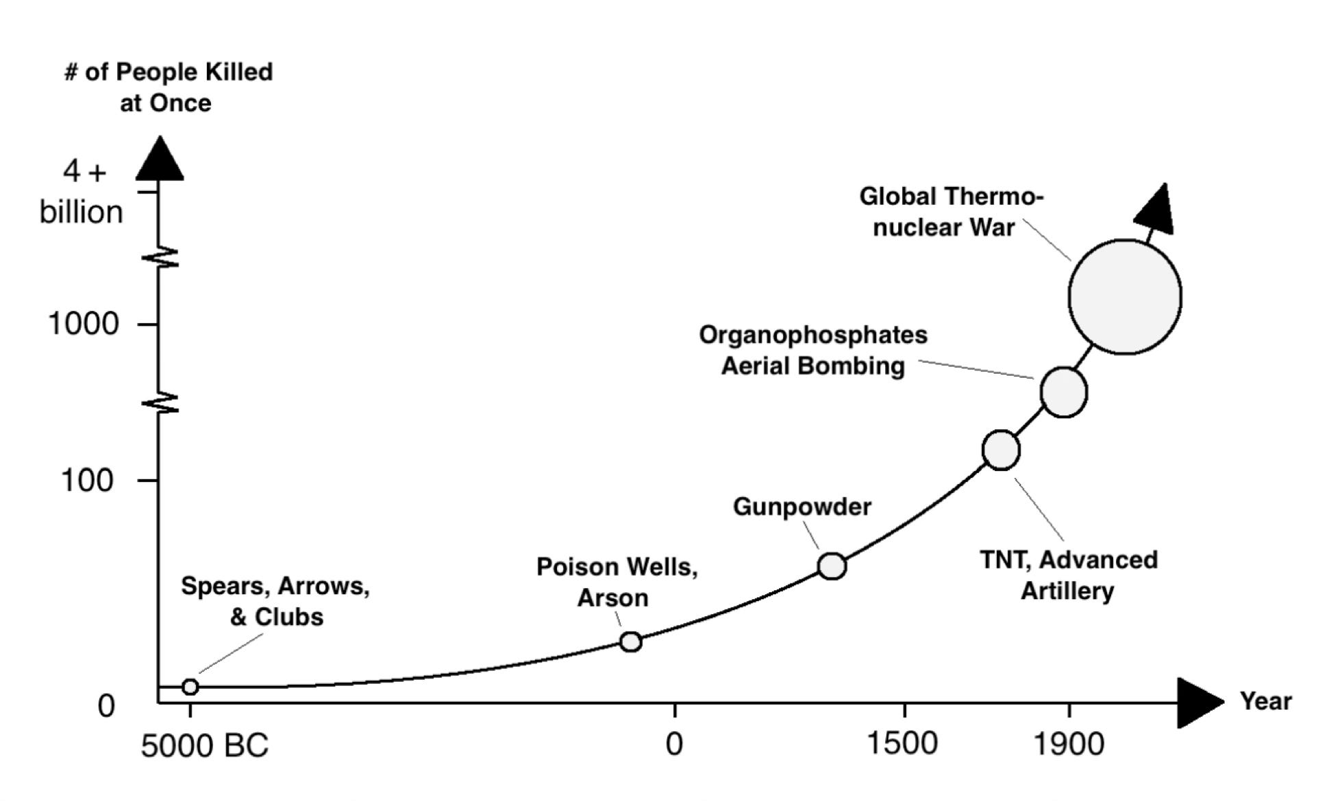 Another way to put this is that the k/k ratio — that is, the ratio of killers to those killed — is dramatically falling. One lone wolf, or a single group of malicious individuals, can harm more people than ever before. At the extreme, they could potentially harm a sizable fraction of the human population and perhaps even precipitate the extinction of our species. I’m not convinced that such claims are hyperbolic (but you are more than welcome to argue that I’m wrong below! After all, I might be and hope that I am!).