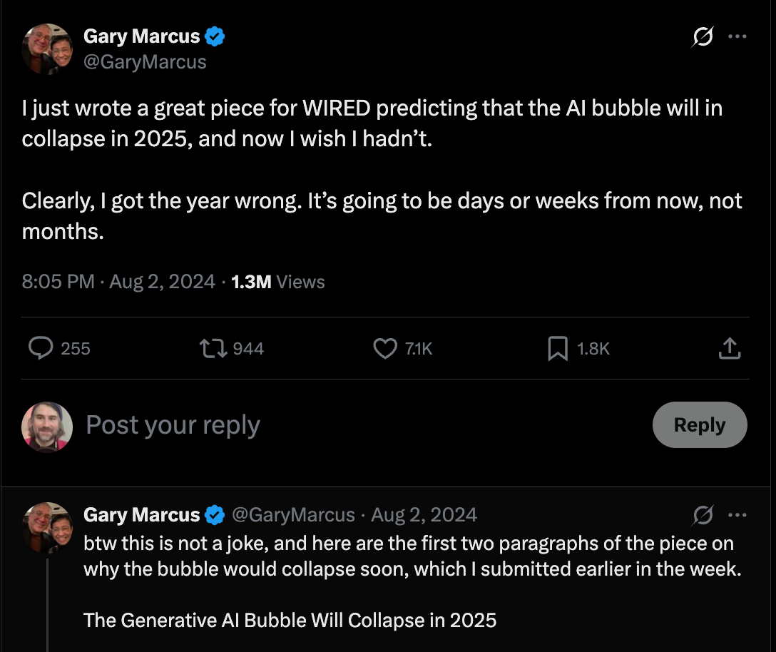 From AI evangelists to AI skeptics, Gary Marcus posted on X last year that he penned an article for Wired in which he argues the AI bubble will burst in 2025. But he then backtracked, claiming that the bubble would in fact pop before the end of 2024! Another swing and a miss, and I personally see no strong evidence for the bubble bursting in the very near future. I wouldn’t be surprised, though, if it happens before the end of 2026. (We’ll see how silly I look in a year! :-).