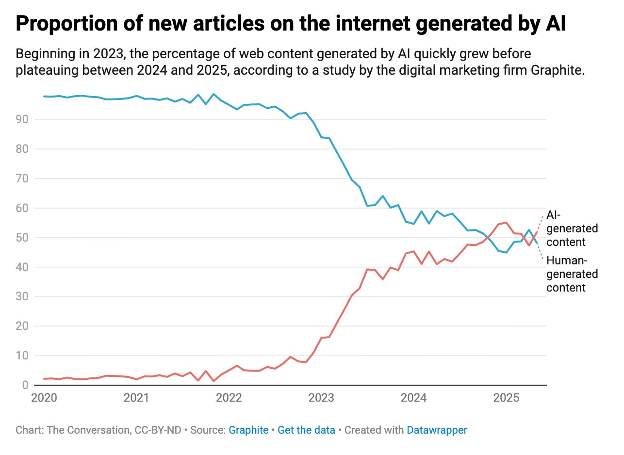 Roombas aside (which we’ve had for quite a while), the first sentence doesn’t hold up well. But the second might, depending on what one means by “human effort.” As The Conversation reports, it’s now true that “more than 50% of articles on the web are being generated by artificial intelligence,” though I don’t believe this study includes articles behind a paywall. Also, these “AI-generated articles consist largely of general-interest writing: news updates, now-to guides, lifestyle posts, reviews and product explainers,” where the “primary economic purpose of this content is to persuade or inform, not to express originality or creativity.”