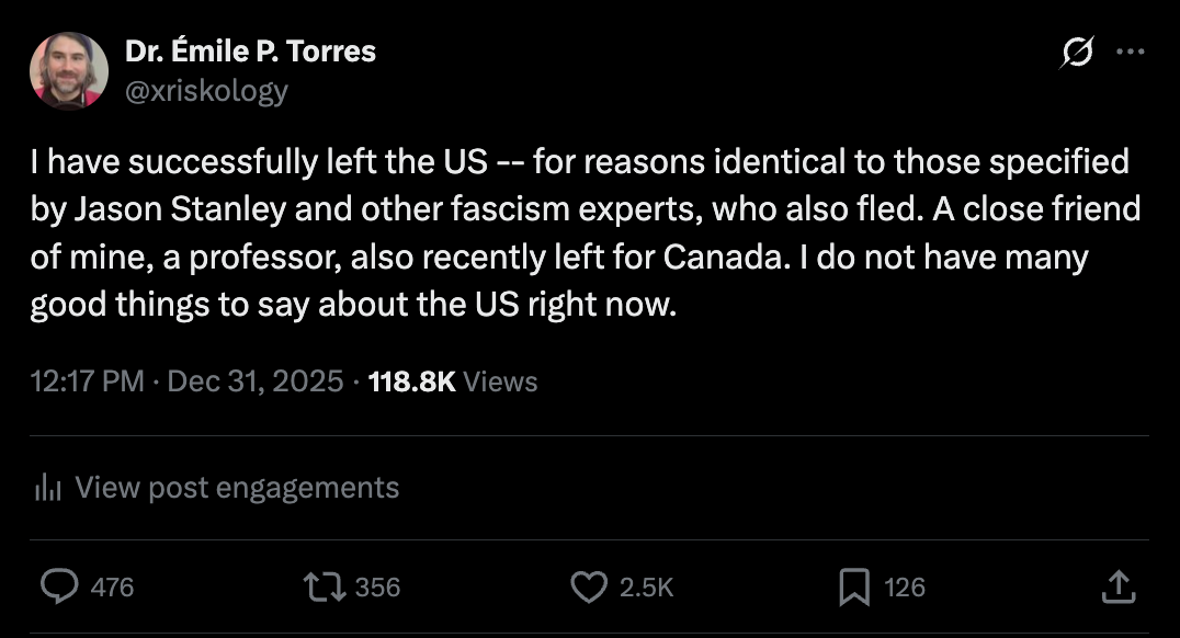 These are just a few reasons that I fled the US in December 2025. My departure follows that of other academics, including experts in authoritarianism and fascism like Jason Stanley and Marci Shore, both of whom taught at Yale University. As Stanley, author of How Fascism Works, told The Daily Nous last year, he wanted “to raise my kids in a country that is not tilting towards a fascist dictatorship.”