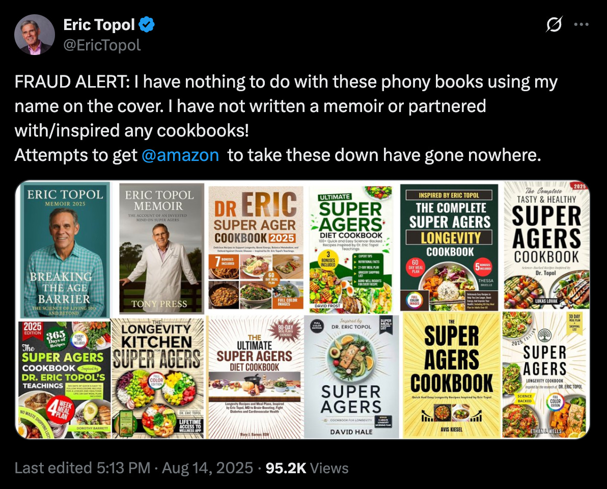 Consider a guy — in this case, a real person — named Tommi Pedruzzi, who recently boasted about having self-published 1,500 nonfiction books using AI. There’s no evidence that he’s that prolific, but the fact is that AI “scam” books, like those supposedly written by Topol, are all over Amazon.