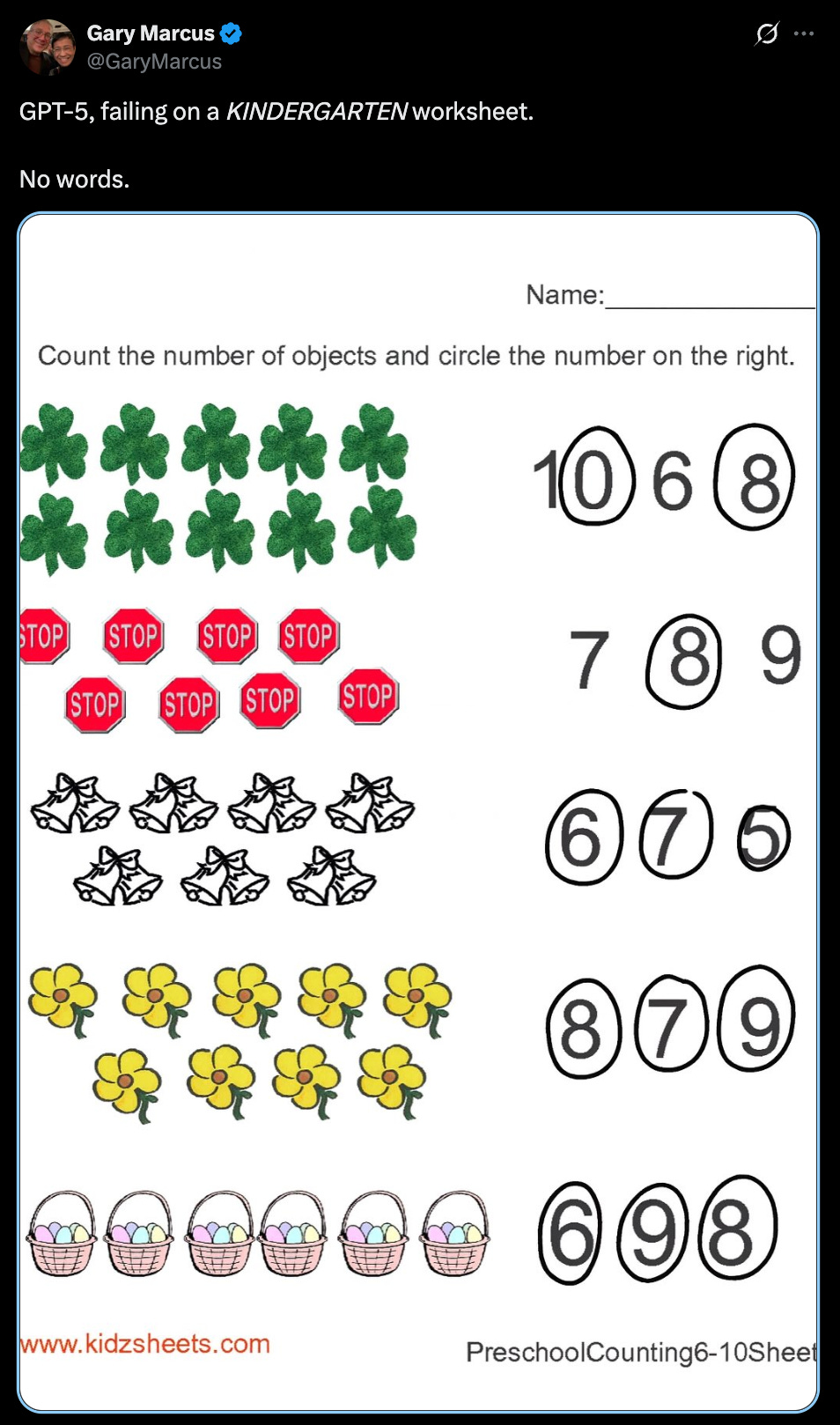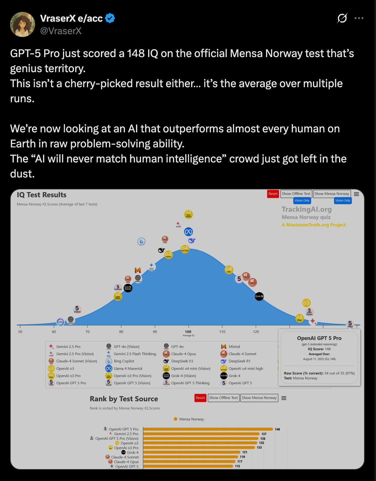 Let me end on a slightly lighter note, though — a juxtaposition that illustrates just how weird our moment with AI is. Consider, on the one hand, the patently absurd claim that “GPT-5 just scored a 148 IQ on the official Mensa Norway test,” which is “genius territory.” The person who posted this, a member of the deplorable e/acc movement, declares that “this isn’t a cherry-picked result either… it’s the average over multiple runs.”