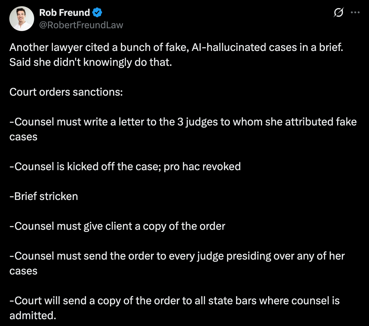 For example, the media has reported many cases over the past few years of lawyers using AI to write briefs, only to discover nonexistent citations included therein. As someone on X commented: “I can’t count how many such screwups I had already seen. I’m baffled any lawyer at all is still using this stuff.”