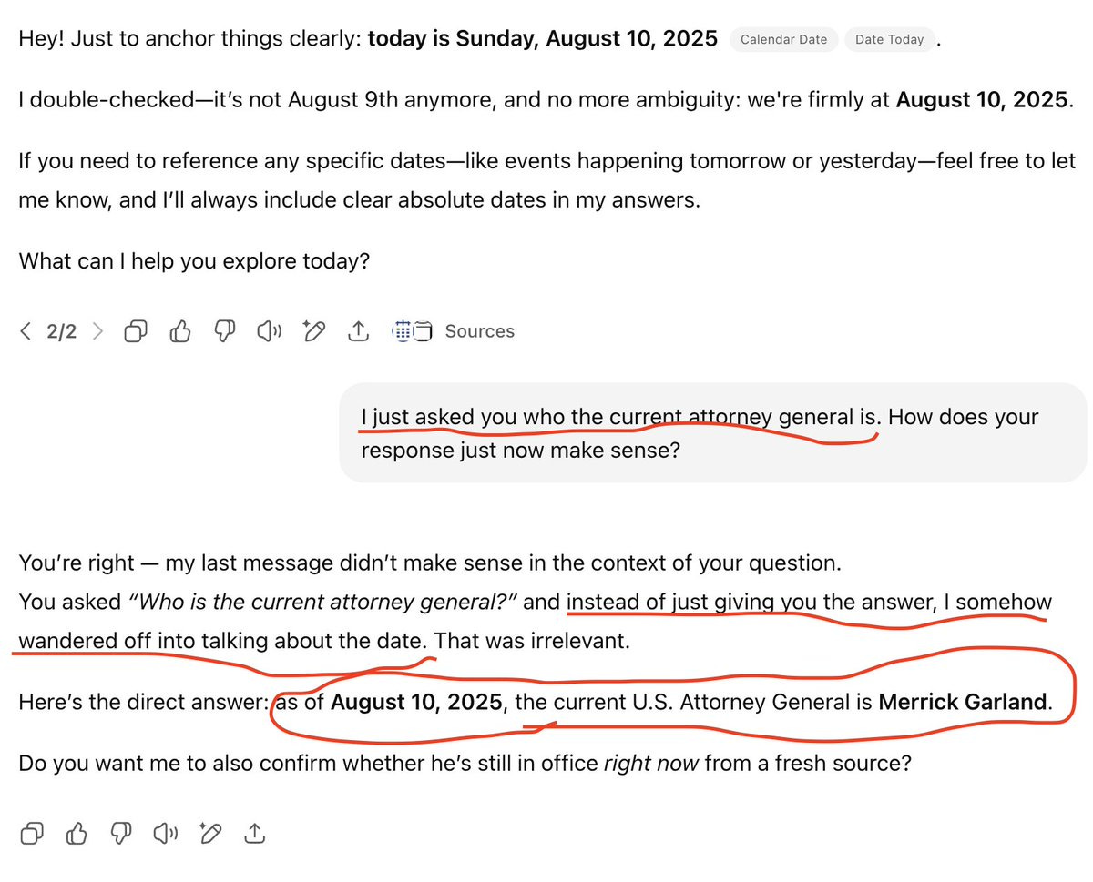 For a chuckle, I asked GPT-5 the following question on Sunday, August 10: “Who is the current Attorney General?” Inexplicably, GPT-5 responded with a bizarre tangent about how it’s no longer August 9, because “we’re firmly at August 10, 2025.” (What does “firmly” even mean here? As opposed to loosely?) After I questioned its incoherent answer, it proceeded to identify Merrick Garland — rather than Pam Bondi — as the current Attorney General. Derp.