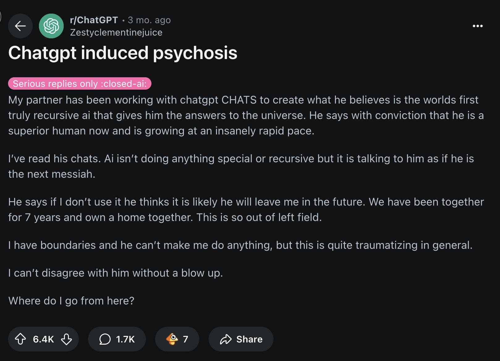 Another doctor, Keith Sakata, at the University of California San Francisco, says on social media that in 2025 alone he has personally “seen 12 people hospitalized after losing touch with reality because of AI.” In one tweet, he includes this screenshot from Reddit as an example: